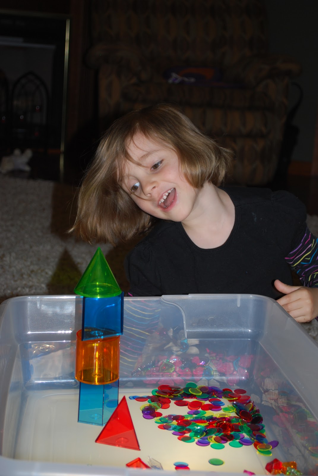 The tote I painted sits upside down, and the unpainted tote on top. Then I gave O various transparent items to play with in it.